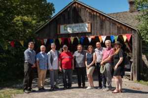 Éric Dufresne de la Corporation touristique la Seigneurie des Aulnaies, André Simard, maire de Saint-Roch-des-Aulnaies, Steve Beaulieu, meunier, Réjean Labbé, ancien meunier, André Anglehart, dg Seigneurie des Aulnaies, Marie-Ève Proulx, député Côte-du-Sud, Bernard Généreux, député de Montmagny-L’Islet-Kamouraska-Rivière-du-Loup, Marc-André Rioux, président Semaine du patrimoine et Christine Bricault du Conseil québécois du patrimoine vivant.
