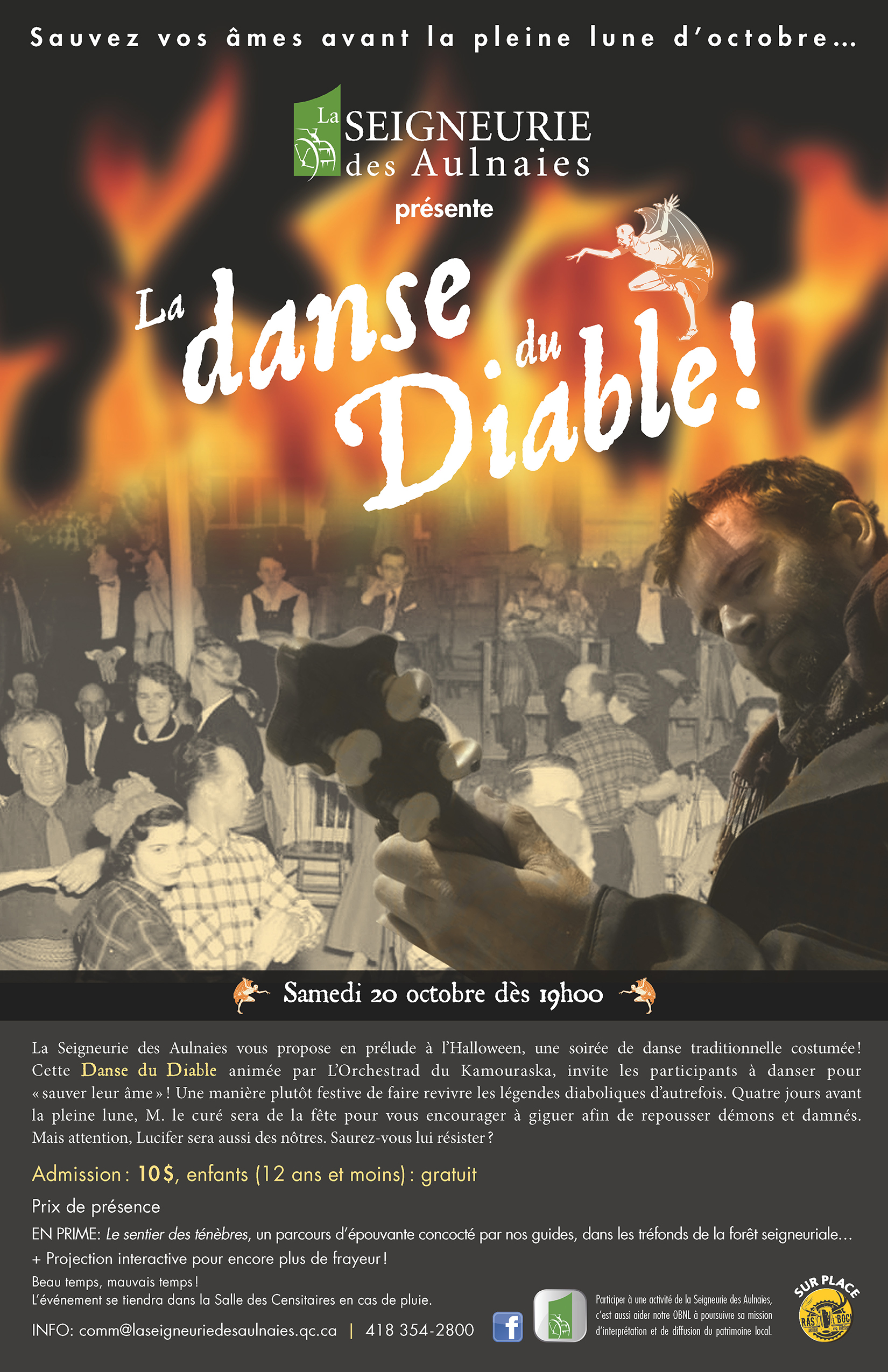 Saint-Roch-des-Aulnaies, 4 octobre 2018 – La Seigneurie des Aulnaies invite la population à venir danser pour chasser le Diable et les damnés, juste avant l’Halloween, le 20 octobre prochain. Certains Contes et Légendes de la Côte-du-Sud affirment que le Prince de l’obscurité sort toujours des ténèbres avant la pleine lune d’octobre. Tout juste après les récoltes et avant l’hiver, il surgit des ténèbres dans des endroits boisés, isolé et toujours rattaché au passé comme le domaine seigneurial. Pour conjurer le mauvais sort, L’Orchestrad du Kamouraska vous invite, comme dans le bon vieux temps, à une veillée de danse traditionnelle avec « calleux ». Il semblerait que les veillées traditionnelles avec violon, « tapeux » de pied et sets-carrés nous aideront à dévoiler le vrai visage du Diable. Pendant la soirée, un conteur nous remémorera les légendes qui ont marqué notre folklore. Des légendes, souvent pas très loin de la réalité, que les français de Nouvelle-France ont apporté avec leurs croyances culturelles et religieuses dans leur migration. Des symboles forts qui ont traversé le temps et l’espace et qui se sont adaptés à notre environnement pour alimenter l’imaginaire et animer les longues soirées d’hiver d’antan.