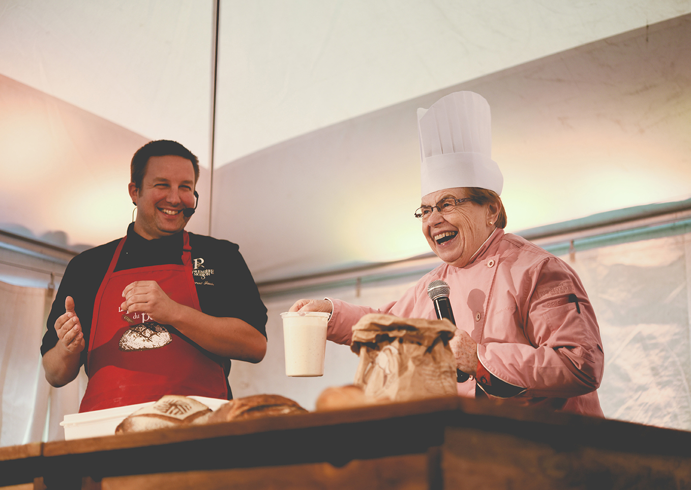 Le samedi après-midi, la conférence-démonstration de Sœur Angèle, notre invitée d’honneur, et de Laurent Gaudré, directeur-produits chez Gestion Première Moisson Inc. et fidèle participant de la FdP depuis les débuts, restera un succès populaire mémorable pour les nombreux visiteurs. Y allant même d’un morceau d’opéra, Sœur Angèle, a su galvaniser son public tout en démontrant les bienfaits du bon pain au levain! Et, bien sûr, elle aura apporté à cette Fête du pain toute l’énergie rieuse et éclairée qu’elle porte toujours du haut de ses 83 ans! Le public, les artisans boulangers et les producteurs régionaux sont tombés sous son charme.